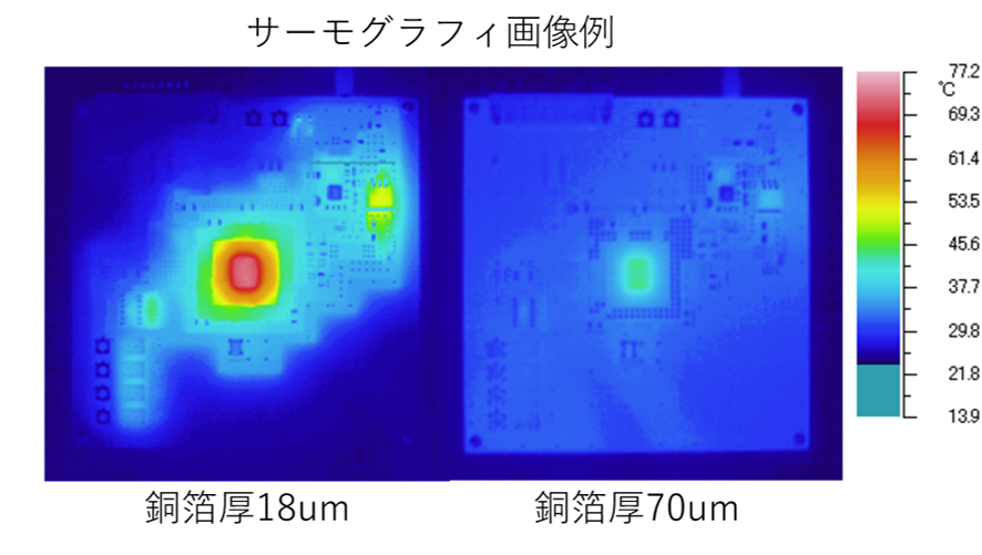 温度上昇は、はんだクラックや基板反りを招くため、開発初期から熱設計・検証を組み込むことが重要です。厚銅やサーマルビア・メタルコアや銅コインなど、PCBの仕様に合わせた構造の検討を行います。