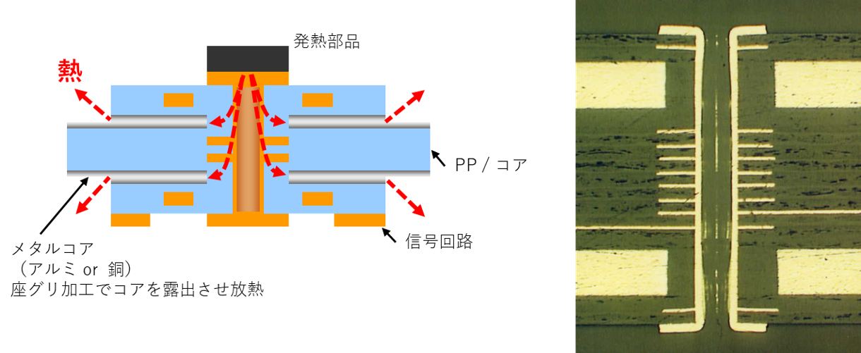 アルミや銅をコアとして積層したメタルコアPCBは、金属コアの高い熱伝導によって熱を迅速に逃がします。また、PCBの機械的強度のアップ・軽量化やメタルコアによる電磁シールドといったメリットもあります。