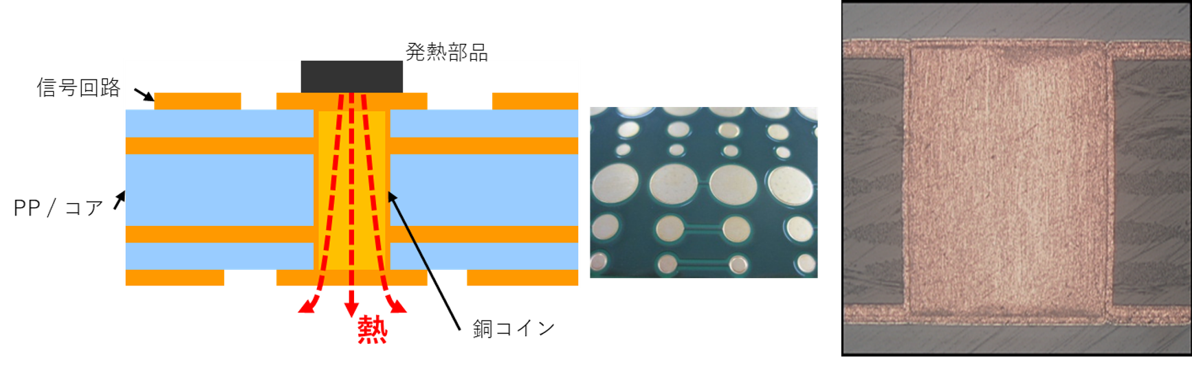 銅コインは、発熱源の直下に銅ブロックを埋め込むことで、発熱源から銅コインを経由して筐体やヒートシンクまで、熱を"短く太い"経路で直接伝導する放熱構造です。サーマルビアを多数配置する場合に比べて、銅コインは断面積が大きく、接合面も少ないため、熱抵抗を大幅に低減できます。