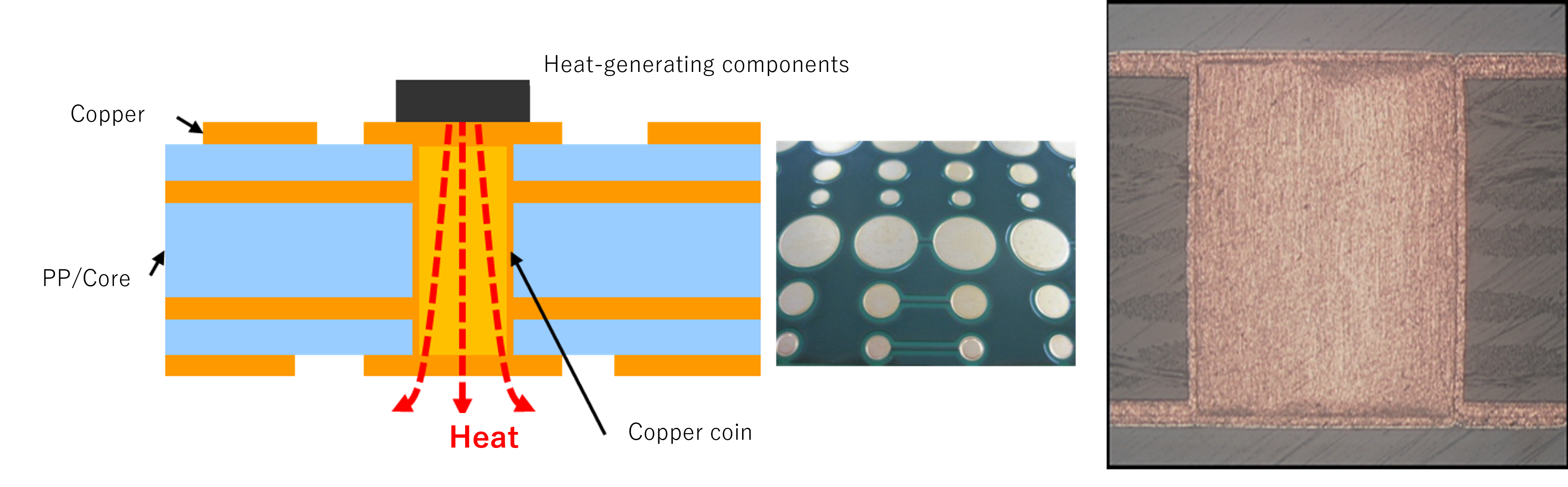 Copper coins can be selectively placed only where needed and are also compatible with fine-pitch wiring and narrow-pitch BGAs, enhancing design flexibility. Through thermal simulations that consider layer configuration and surrounding planes, we determine the optimal coin size and assess the temperature reduction effect. Copper coins are especially effective in areas with spot heat generation or where direct heat transfer to the chassis is feasible.